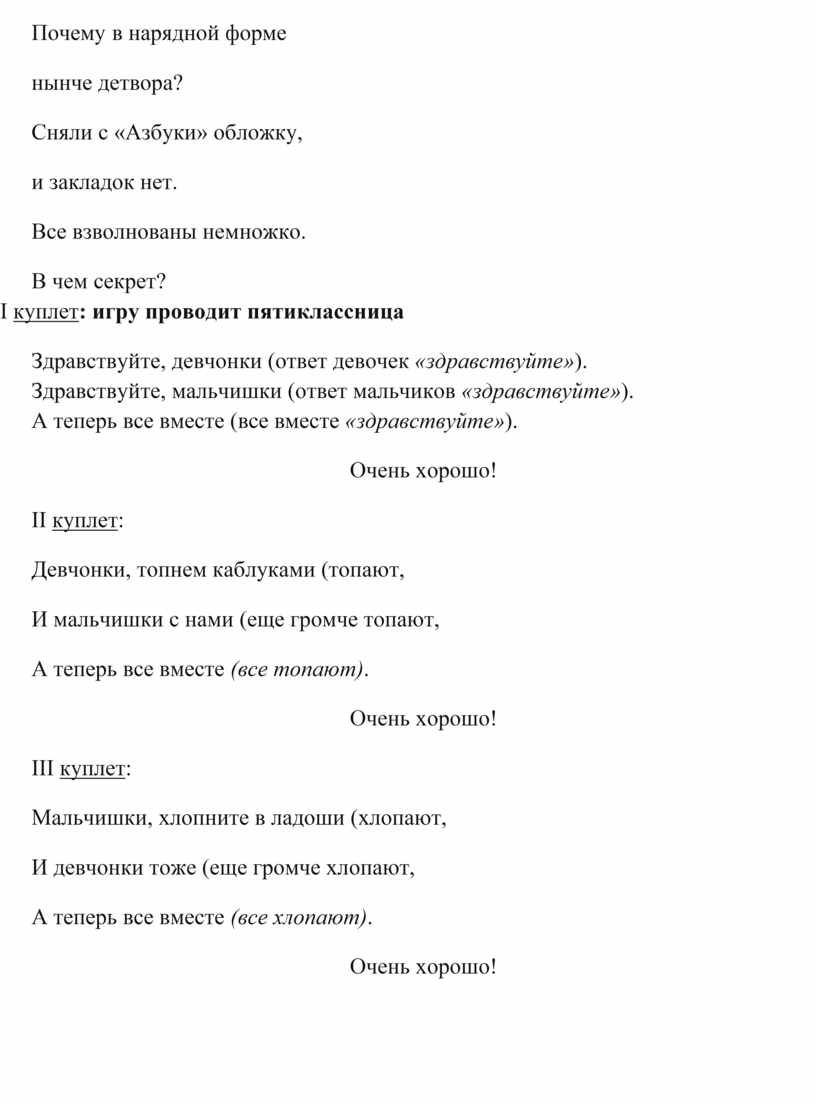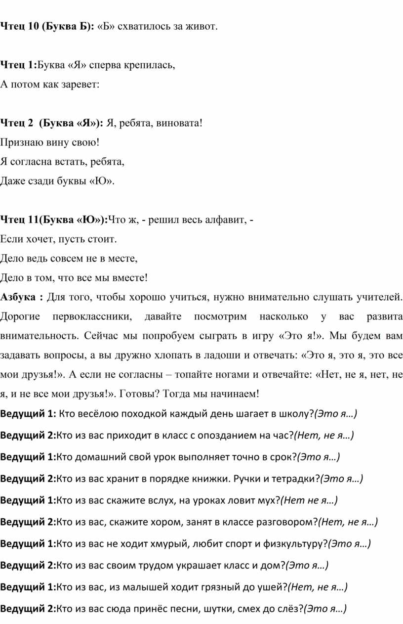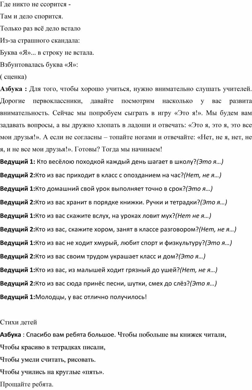 Азбука : Для того, чтобы хорошо учиться, нужно внимательно слушать учителей. Дорогие первоклассники, давайте посмотрим насколько у вас развита внимательность. Сейчас мы попробуем сыграть в игру «Это я!». Мы будем вам задавать вопросы, а вы дружно хлопать в ладоши и отвечать: «Это я, это я, это все мои друзья!». А если не согласны – топайте ногами и отвечайте: «Нет, не я, нет, не я, и не все мои друзья!». Готовы? Тогда мы начинаем!