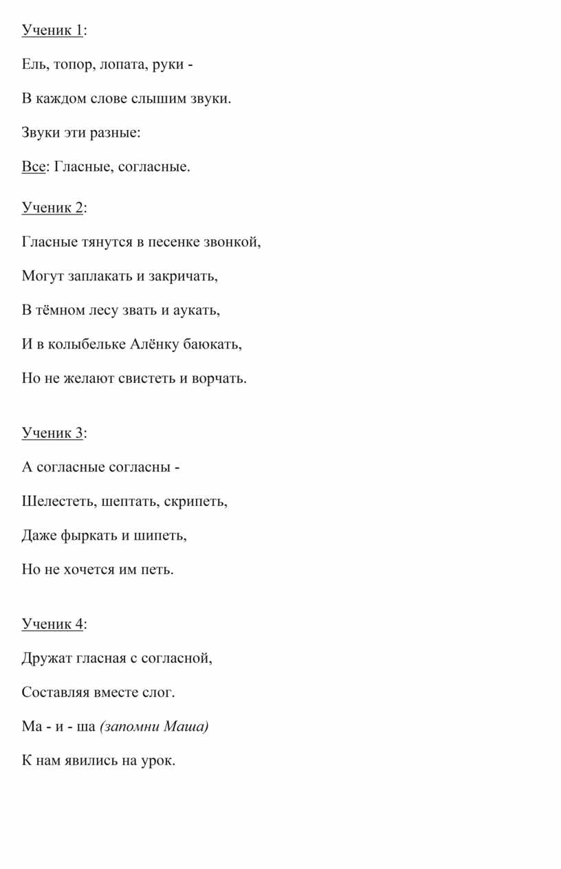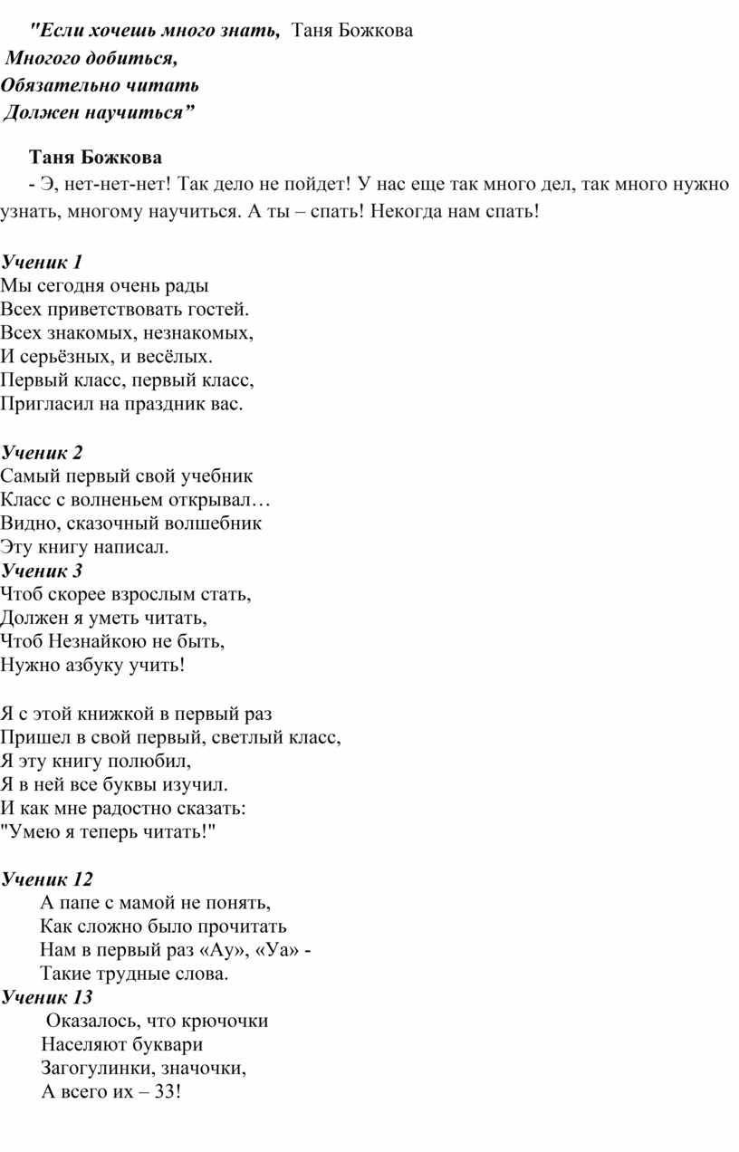 Совсем недавно, 1 сентября, вы впервые переступили порог школы. Вы были совсем маленькими девочками и мальчиками. Идя в школу, вы расспрашивали своих родных о школе. А некоторые из вас даже боялись идти в школу. Сейчас вы уже ничего не боитесь, умеете читать и писать. Теперь вы уже никого не спрашиваете о школе, а можете сами рассказать, чему учат в школе.