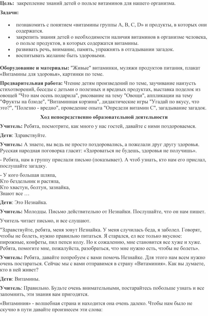 Учитель: Молодцы ребята, хорошие советы вы дали Незнайке. Я думаю, что, если он будет есть витамины, обязательно выздоровеет. Где мы с вами побывали сегодня? Что вам запомнилось? (ответы детей).