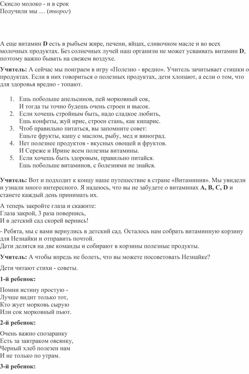 Учитель: Вот и подходит к концу наше путешествие в стране «Витаминия». Мы увидели и узнали много интересного. Я надеюсь, что вы не забудете о витаминах А, В, С, D и станете каждый день принимать их.