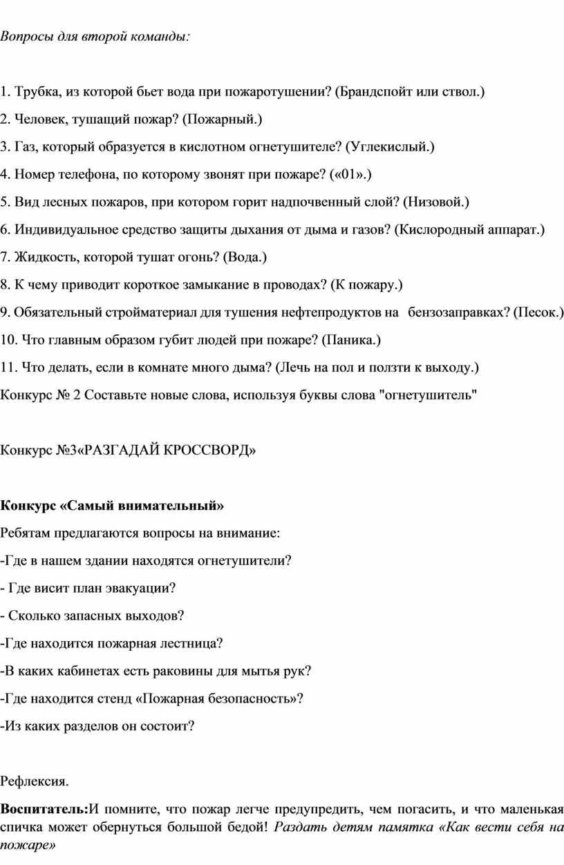 Воспитатель: Сегодня на нашем мероприятии мы ещё раз вспомнили правила пожарной безопасности, как надо себя вести в таких ситуациях. Сейчас мы проверим ваши знания по этим правилам. Проведем соревнования между двумя командами.