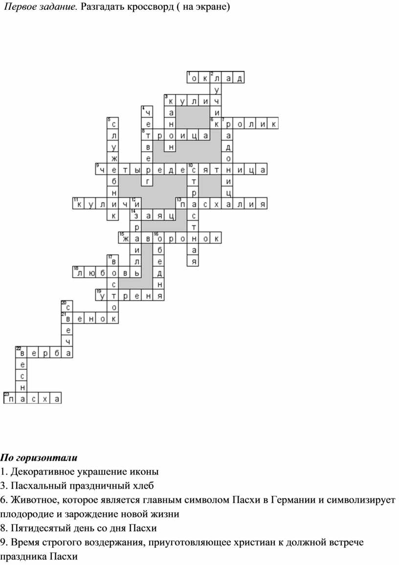 В России Пасху называли Велик день, Светлый день. У крестьян существовало поверье, что на Пасху солнце играет. Пасха была очень большим праздником, длившимся неделю, и вся эта неделя была заполнена различными играми, развлечениями и хождением в гости. На пасху принято было поздравлять друг друга с праздником, христосоваться и обмениваться крашеными яйцами. На Пасху существовал обычай загадывать желание, стоя в церкви на заутрене – утренней службе. Испокон наши предки почитали яйцо, как символ жизни, плодородия, святого воскрешения. Яйцами обменивались, чтобы только добро и свет приставали к душам, чтобы стылое, худосочное, под стать скорлупе, в этот день отстало, и наружу смогло бы проклюнуться истинное, что есть в человеке. Яйцо могло свести порчу и охранить человека от сглаза. А ещё на Пасху пекли вкусные куличи. Кулич занимает важное место в пасхальном ритуале. Он символизирует память о том, что Иисус Христос после Воскресения вкушал пищу вместе с апостолами. Сегодня практически каждая семья печёт или покупает готовые куличи, освящает их в церкви. Его значение для христиан символично ещё и потому, что, несмотря на то, что он приготовлен из дрожжевого теста, кулич заменяет ветхозаветные опресноки. Что в принципе означает переход от Ветхого Завета к Новому. И в Евангелии сказано, что во время Тайной вечери Христос благословил именно дрожжевой хлеб. На Руси хозяйки ставили тесто на куличи в огромном количестве- считалось, что так оно лучше выбраживается. В тесто клали много яиц, сахара, сливочного масла. Благодаря такому составу куличи получаются мягкими и долго не черствеют. Готовые куличи богато украшают глазурью, символическими надписями, орехами, цукатами и крашеным пшеном -Ребята, расскажите как вы готовитесь к светлому празднику –Пасхи? (рассказы детей) - А сейчас, ребята, проверим ваши знания о Пасхе. Первое задание. Разгадать кроссворд ( на экране) |
