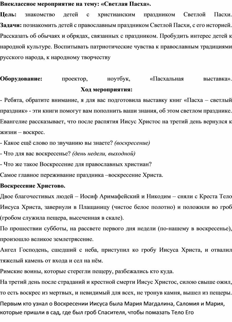 Внеклассное мероприятие на тему: «Светлая Пасха».