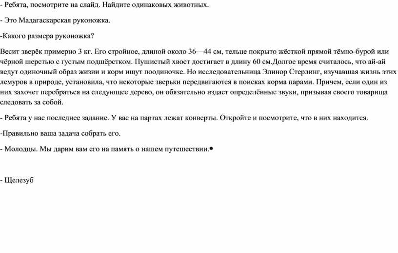 - Мы приземлились на остров Куба. -Посмотрите на экран, как вы думаете какое название у этого животного? -Щелезубы являются одними из немногих ядовитых млекопитающих. Парадоксально, что щелезубы не имеют иммунитета к собственному яду и погибают даже от лёгких укусов, полученных во время драк между собой. - В какой местности встречаются щелезубы? - они обитают в горных лесах, кустарниковых зарослях, изредка заходя на плантации. Ведут наземный образ жизни, активны по ночам. Днём спят в естественных укрытиях или в норах. - Как вы думаете, чем питается щелезуб? -Питаются как животной, так и растительной пищей: беспозвоночными, мелкими ящерицами, плодами, а также падалью. По некоторым сведениям, нападают на домашнюю птицу. - Как вы думаете, как щелезуб добывает себе пищу? Пищу разыскивают, копаясь мордой и лапами в рыхлой почве и листовом опаде. Во время еды зверёк садится, опираясь на ступни и основание хвоста, и держит пищу передними лапами. Неуклюжи, но бегают довольно быстро; способны неплохо лазать. Весьма агрессивны; в неволе легко приходят в ярость и даже бросаются на человека. - Ребята, посмотрите на экран и выполните задание. Ваша задача собрать слова и определить названия животных. Какие из них являются дикими, а какие домашними? Правильно, а мы отправляемся дальше. -Молодцы. А теперь отправляемся дальше. - Наша остановка- Парагвай. Посмотрите, как называется это животное? Правильно- Гривистый волк. - А как вы думаете, что означает его название? В переводе с греческого его название означает «короткохвостый золотистый пёс».Гривистый волк обладает уникальной внешностью. - Посмотрите на слайд. Как вы думаете, на кого похож гривистый волк? Он, скорее, похож на крупную лисицу на высоких, стройных ногах, чем на волка. Какой образ жизни ведут гривистые волки? Гривистые волки ведут ночной и сумеречный образ жизни, — в течение дня они обычно отдыхают среди густой растительности, изредка перемещаясь на небольшие расстояния.Гривистый волк населяет в основном открытые травянистые и кустарниковые равнины. Его можно встретить на холмистых равнинах северного Парагвая. Длинные ноги позволяет ему легко пробираться среди высокой травы и издалека замечать добычу. В горах или дождевых лесах он не встречается. - А чем же питается гривистый волк? -Питается гривистый волк пищей животного и растительного происхождения. Охотится он преимущественно на некрупных животных: грызунов, кроликов, броненосцев. Поедает также птиц и их яйца, рептилий, улиток и насекомых; ест бананы, гуаву и растение из рода паслён. Ест также корни и клубни различных растений. При случае гривистый волк нападает на домашнюю птицу; изредка может унести новорожденного ягнёнка или поросёнка. На людей гривистые волки не нападают. - физминутка - И следующая наша остановка- Африка. Посмотрите на это удивительное животное. Как же оно называется? -Это африканская циветта. Кого она вам напоминает? По форме тела африканская циветта похожа на кошку. В неволе африканских циветт держат только в клетках. -А чем же ее кормят? -Кормят мясом и особенно птицами. Если циветта поймана молодой, она скоро становится ручной.Распространена в Африке южнее Сахары. - Посмотрите на слайд. Найдите лишнее животное. - Молодцы. - Мы отправляемся на остров Сулавеси. - Как вы думаете кто же это? Это медвежий кускус. Ведут древ