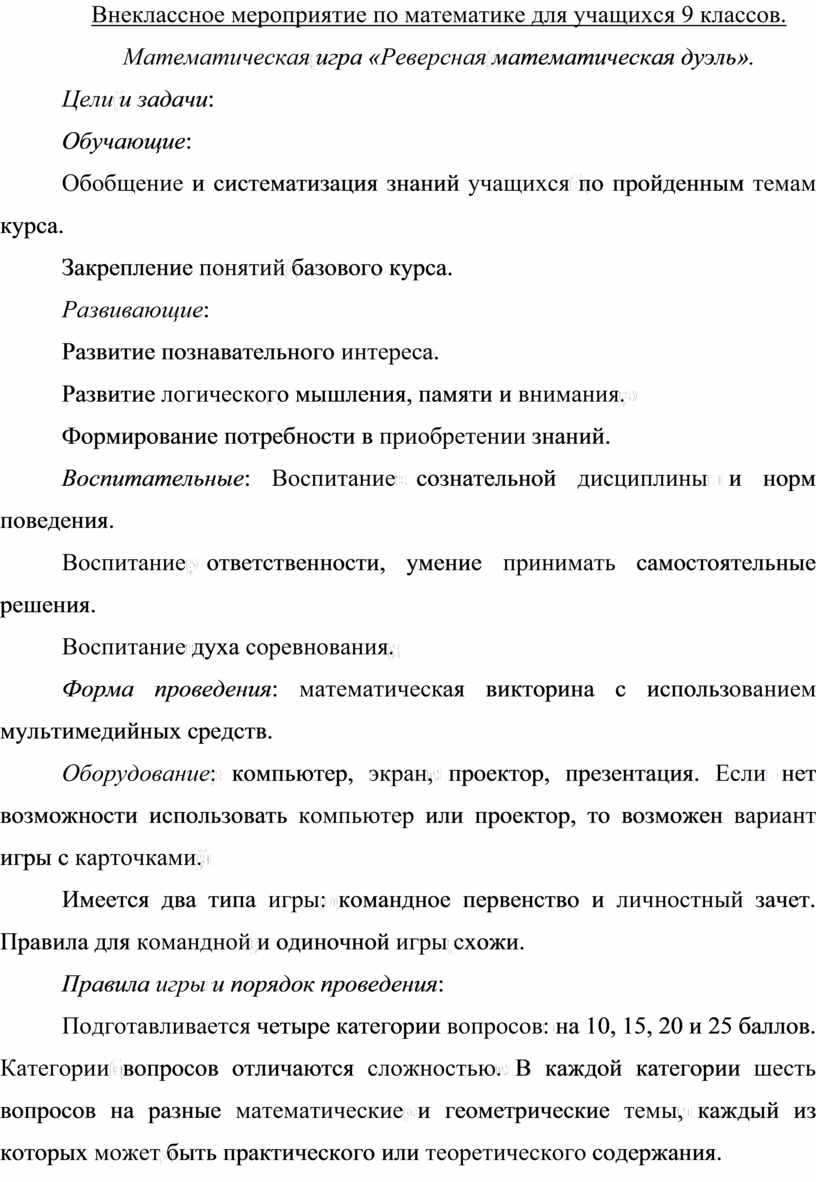Внеклассное мероприятие по математике для учащихся 9 классов.