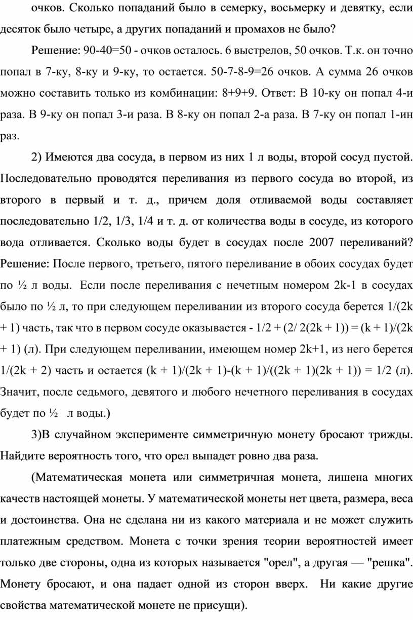 2) Имеются два сосуда, в первом из них 1 л воды, второй сосуд пустой. Последовательно проводятся переливания из первого сосуда во второй, из второго в первый и т. д., причем доля отливаемой воды составляет последовательно 1/2, 1/3, 1/4 и т. д. от количества воды в сосуде, из которого вода отливается. Сколько воды будет в сосудах после 2007 переливаний? Решение: После первого, третьего, пятого переливание в обоих сосудах будет по ½ л воды. Если после переливания с нечетным номером 2k-1 в сосудах было по ½ л, то при следующем переливании из второго сосуда берется 1/(2k + 1) часть, так что в первом сосуде оказывается - 1/2 + (2/ 2(2k + 1)) = (k + 1)/(2k + 1) (л). При следующем переливании, имеющем номер 2k+1, из него берется 1/(2k + 2) часть и остается (k + 1)/(2k + 1)-(k + 1)/((2k + 1)(2k + 1)) = 1/2 (л). Значит, после седьмого, девятого и любого нечетного переливания в сосудах будет по ½ л воды.)
