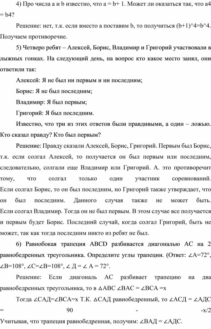5) Четверо ребят – Алексей, Борис, Владимир и Григорий участвовали в лыжных гонках. На следующий день, на вопрос кто какое место занял, они ответили так: