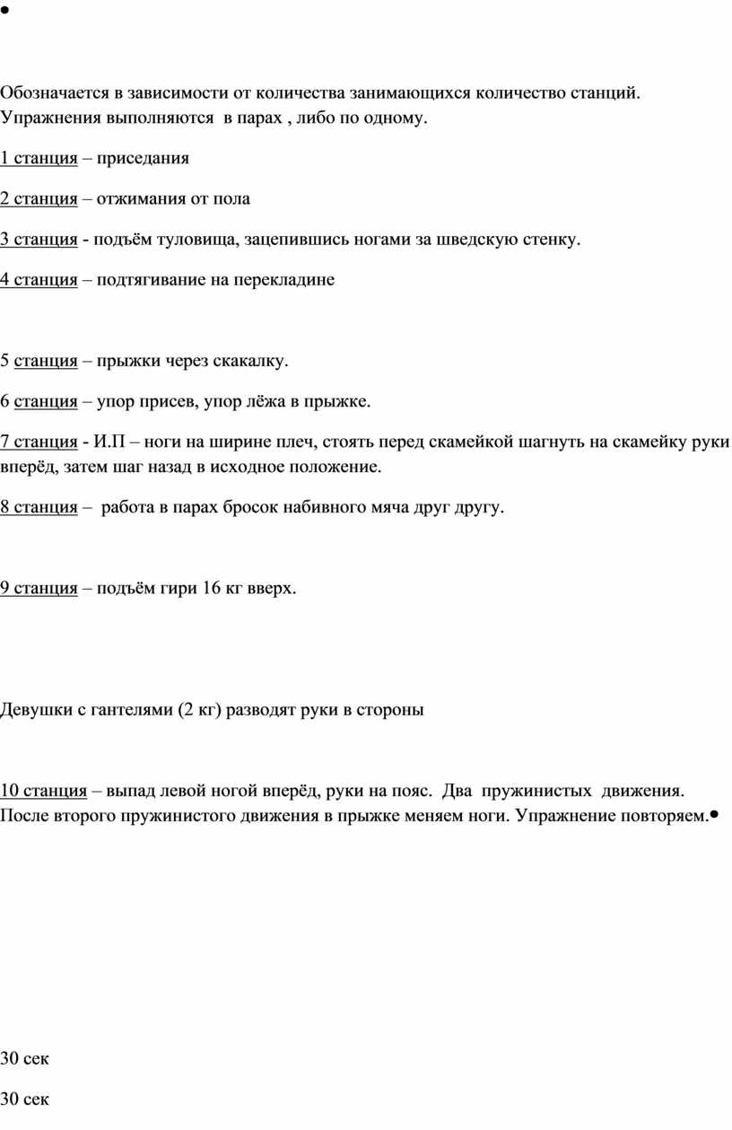 Обозначается в зависимости от количества занимающихся количество станций. Упражнения выполняются в парах , либо по одному. 1 станция – приседания 2 станция – отжимания от пола 3 станция - подъём туловища, зацепившись ногами за шведскую стенку. 4 станция – подтягивание на перекладине