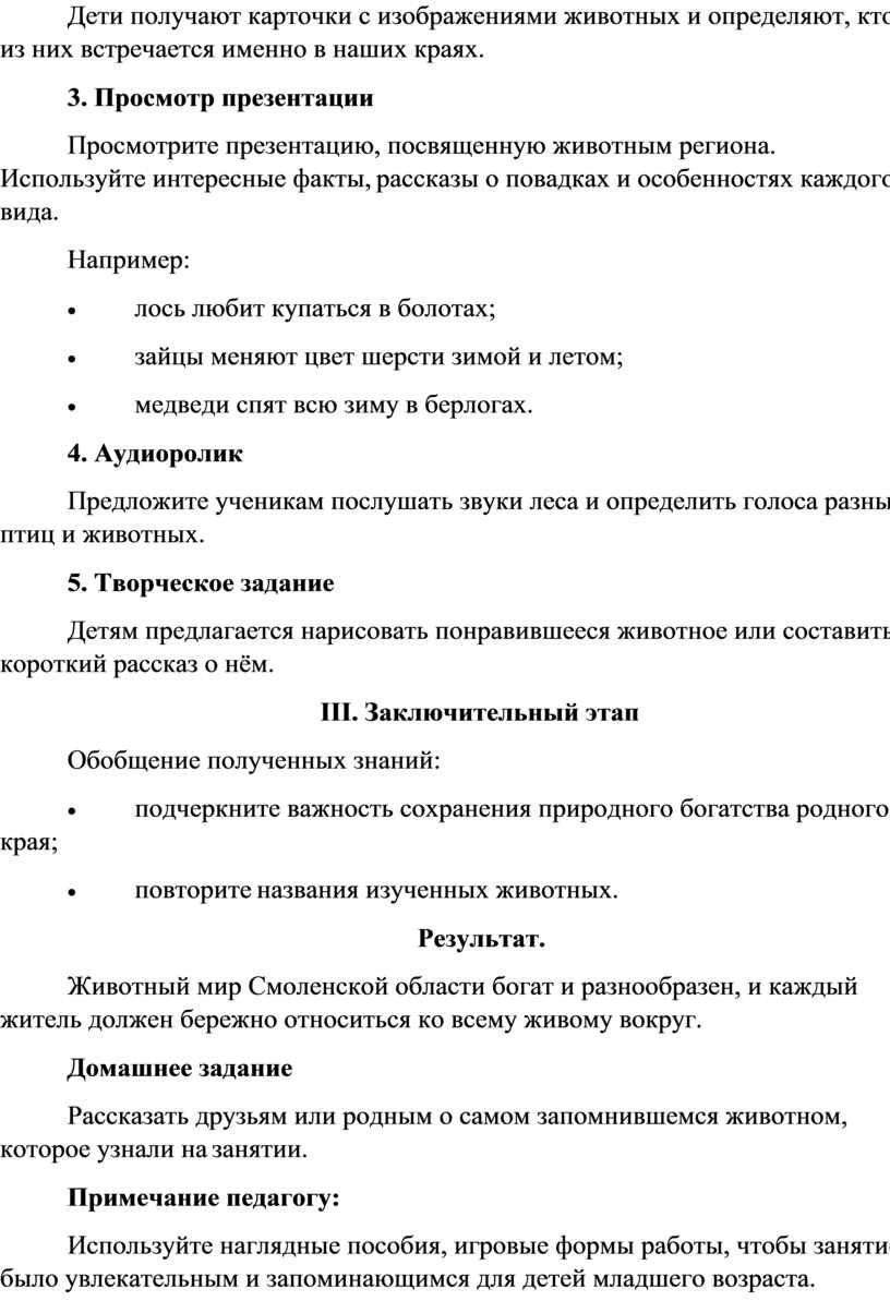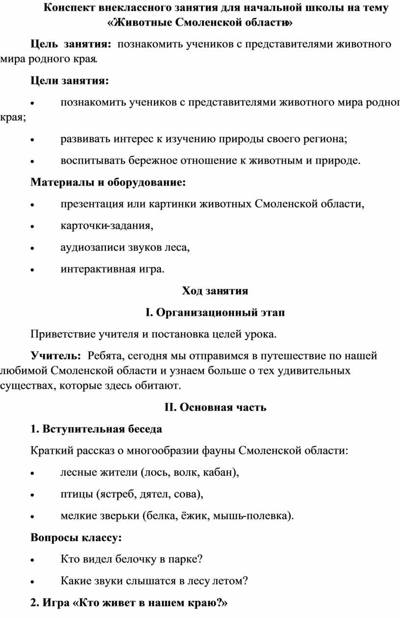 Конспект внеклассного занятия для начальной школы на тему «Животные Смоленской области»