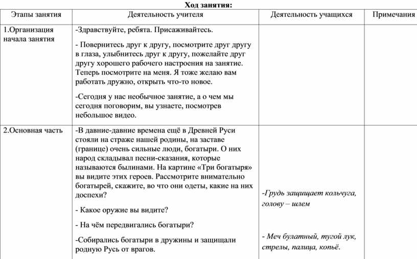 -В давние-давние времена ещё в Древней Руси стояли на страже нашей родины, на заставе (границе) очень сильные люди, богатыри. О них народ складывал песни-сказания, которые называются былинами. На картине «Три богатыря» вы видите этих героев. Рассмотрите внимательно богатырей, скажите, во что они одеты, какие на них доспехи? - Какое оружие вы видите? - На чём передвигались богатыри? -Собирались богатыри в дружины и защищали родную Русь от врагов. -Нашу родину окружали и сейчас окружают разные страны, и не все они относились к нам дружелюбно. С давних пор было необходимо защищать границы. И в наше время границы ни на минуту не остаются без охраны. Но тем, кто идёт к нам с добром, с интересом к нашим людям, стране, мы всегда рады. Для них границы открыты, как и сердца людей. Наш народ славится гостеприимством, сердечностью, добротой. Мы радушно встречаем гостей и туристов. -В наше время защитницей страны является Российская Армия. - Как называется праздник, который отмечают 23 февраля? -Поздравляя защитников Отечества, мы обращаемся с добрыми пожеланиями и приветствиями к защитникам нашего семейного очага, поздравляем всех наших сильных, благородных, ловких, смелых мужчин.