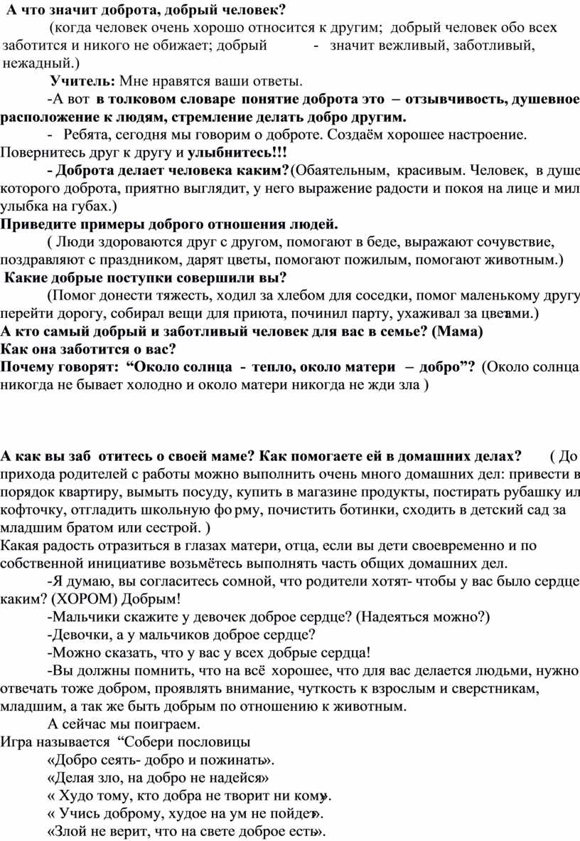 -Ребята, назовите качества доброго, хорошего, положительного человека. (Добрый и жалостливый, благородный и честный, ответственный, умный, дорогой, добросердечный, дружный, душевный, доброжелательный, добродетельный, добродушный, добронравный, добропорядочный, достойный)