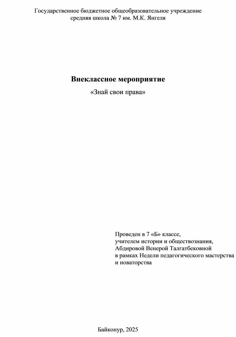 Учитель: Добрый день, обучающиеся, жюри и болельщики. Сегодня мы проводим турнир на тему: «Знай свои права» среди обучающихся 7 класса. Цель нашего мероприятия: в игровой форме закрепить знания о правах человека, воспитание правовой культуры и грамотности подрастающего поколения. Возможно, для некоторых мы сегодня откроем, что-то новое и надеемся нужное.