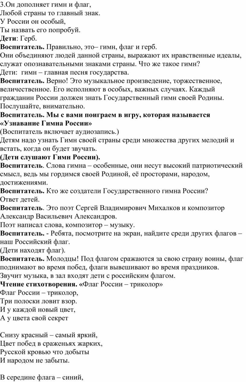 Воспитатель. Слова гимна – особенные, они несут высокий патриотический смысл, ведь мы гордимся своей Родиной, её просторами, народом, достижениями.