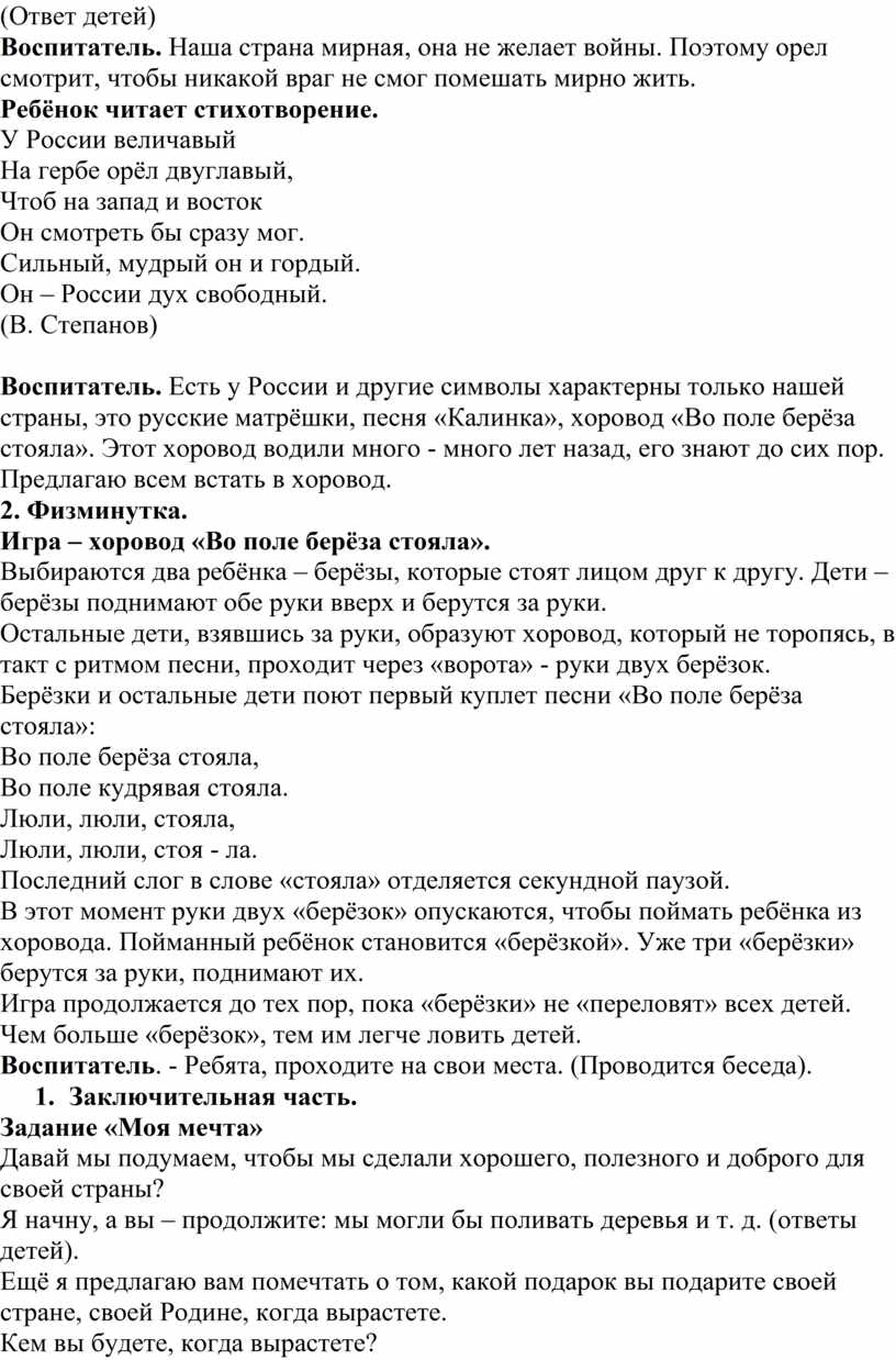 Воспитатель. Вы - маленькие россияне. Вы вырастите и сделаете нашу страну крепкой и могучей, для этого надо любить своих друзей и близких. Учиться и узнавать много нового и интересного, мечтать и стремиться к цели.