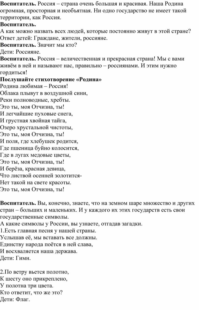 Воспитатель. Россия – величественная и прекрасная страна! Мы с вами живём в ней и называют нас, правильно – россиянами. И этим нужно гордиться!