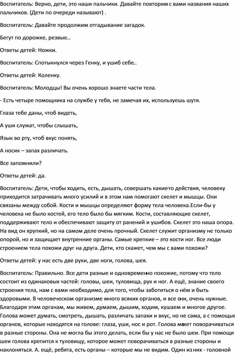 Воспитатель: Дети, сегодня мы поговорим с вами о том, как устроен человек. (Воспитатель показывает куклу-пупса). Это очень важная тема. Но сначала я предлагаю вам отгадать загадки:
