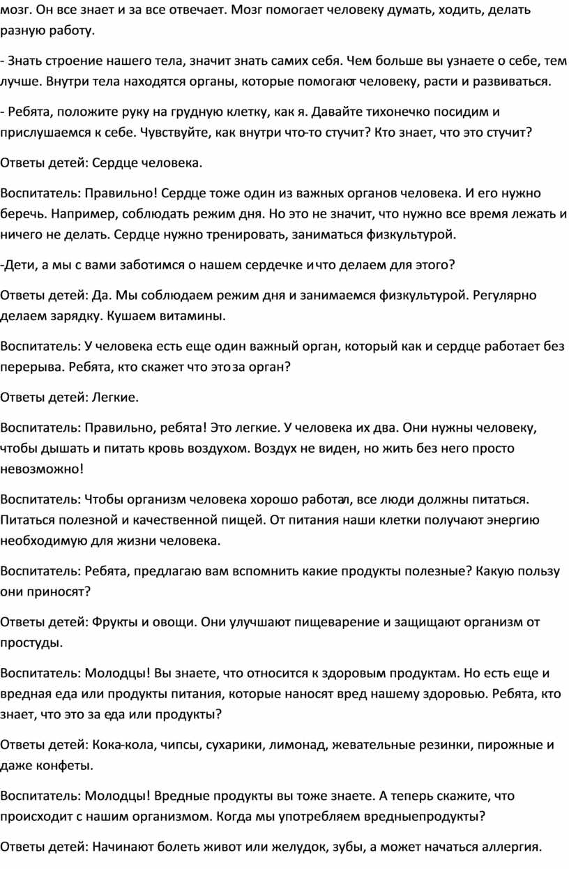 Воспитатель: Правильно. Все дети разные и одновременно похожие, потому что тело состоит из одинаковых частей: головы, шеи, туловища, рук и ног. А ещё, знание своего строения тела, нам с вами необходимо, для того, чтобы заботиться о нём и быть здоровыми. В человеческом организме много всяких органов, и все они, очень нужные. Благодаря этим органам, мы живем, думаем, дышим, ходим, кушаем и многое другое. Голова может думать, смотреть, дышать, различать запахи и вкус, но не сама, а с помощью органов, которые находятся на голове: глаза, уши, нос и рот. Голова может поворачиваться в разные стороны. Она не могла бы этого делать, если бы у нас не было шеи. При помощи шеи голова крепится к туловищу, которое может поворачиваться в разные стороны и наклоняться. А. ещё, ребята, есть органы – которые мы не видим. Один из них - головной мозг. Он все знает и за все отвечает. Мозг помогает человеку думать, ходить, делать разную работу.