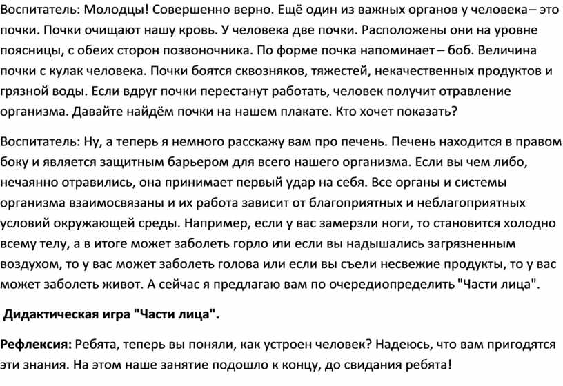 Воспитатель: Ну, а теперь я немного расскажу вам про печень. Печень находится в правом боку и является защитным барьером для всего нашего организма. Если вы чем либо, нечаянно отравились, она принимает первый удар на себя. Все органы и системы организма взаимосвязаны и их работа зависит от благоприятных и неблагоприятных условий окружающей среды. Например, если у вас замерзли ноги, то становится холодно всему телу, а в итоге может заболеть горло или если вы надышались загрязненным воздухом, то у вас может заболеть голова или если вы съели несвежие продукты, то у вас может заболеть живот. А сейчас я предлагаю вам по очереди определить "Части лица".