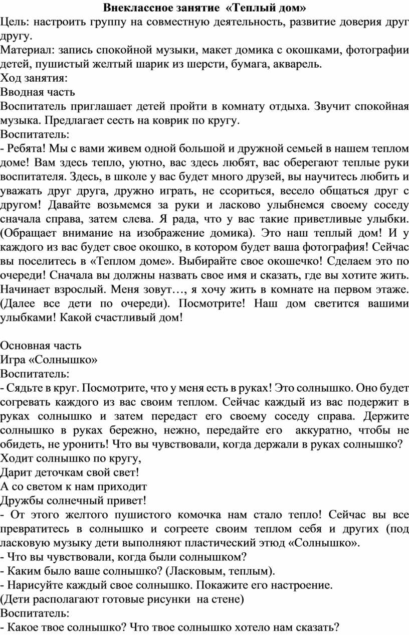 - Сядьте в круг. Посмотрите, что у меня есть в руках! Это солнышко. Оно будет согревать каждого из вас своим теплом. Сейчас каждый из вас подержит в руках солнышко и затем передаст его своему соседу справа. Держите солнышко в руках бережно, нежно, передайте его аккуратно, чтобы не обидеть, не уронить! Что вы чувствовали, когда держали в руках солнышко?