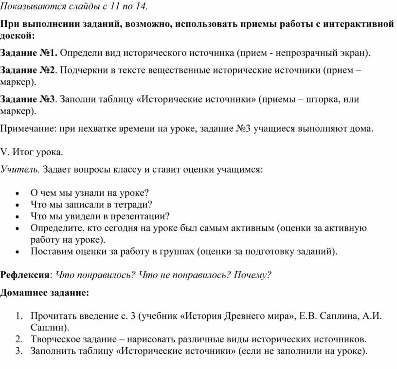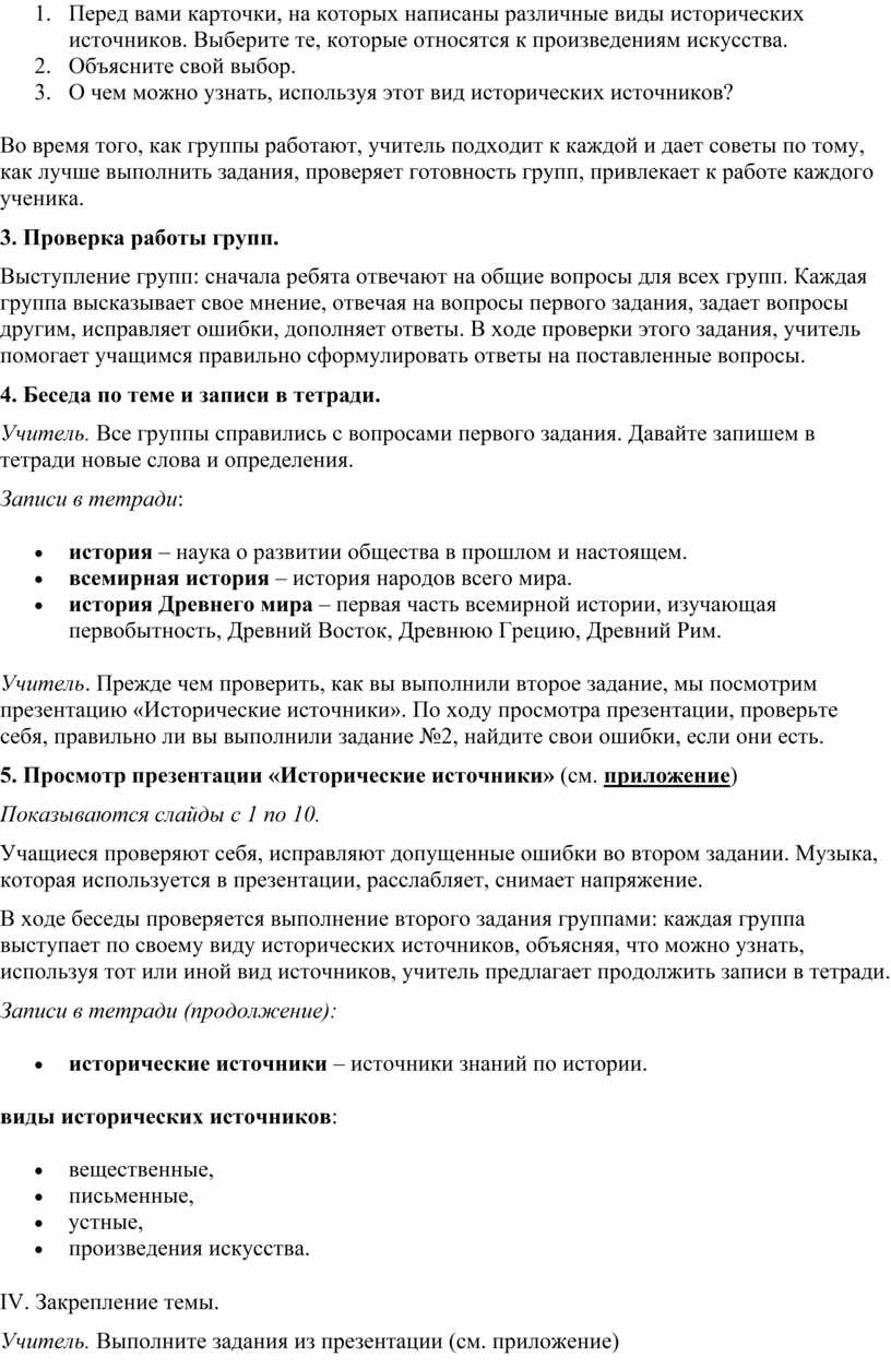 В ходе беседы проверяется выполнение второго задания группами: каждая группа выступает по своему виду исторических источников, объясняя, что можно узнать, используя тот или иной вид источников, учитель предлагает продолжить записи в тетради.