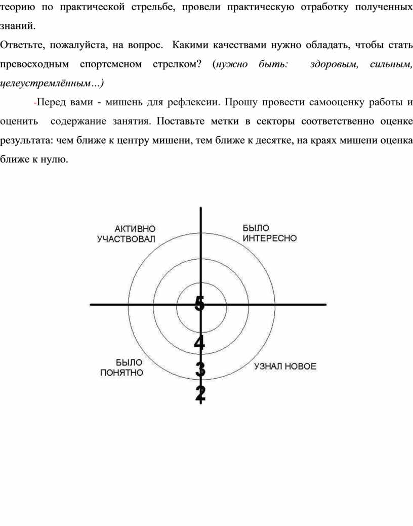 -Вот и подошло к концу наше занятие. Сегодня мы с вами провели викторину на знание спортивной терминологии, занимались физическими упражнениями, изучили теорию по практической стрельбе, провели практическую отработку полученных знаний.