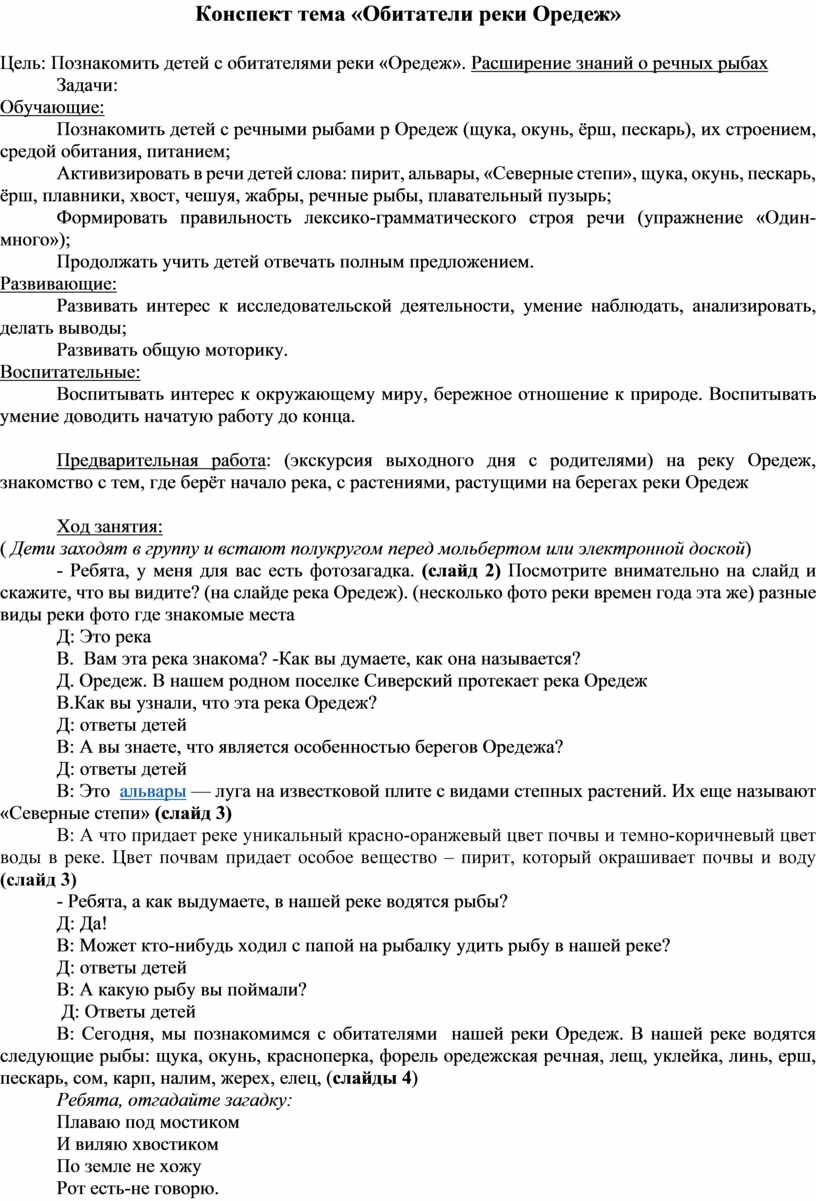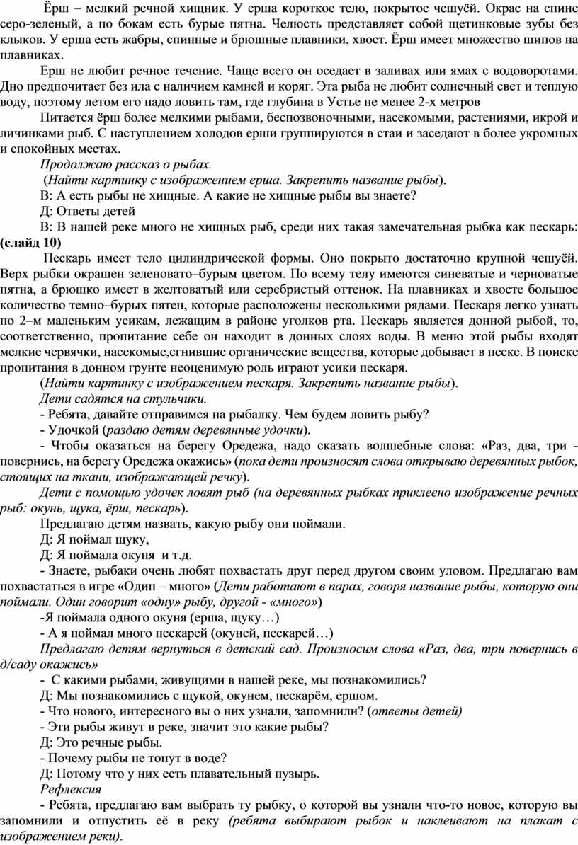 Цель: Познакомить детей с обитателями реки «Оредеж». Расширение знаний о речных рыбах
