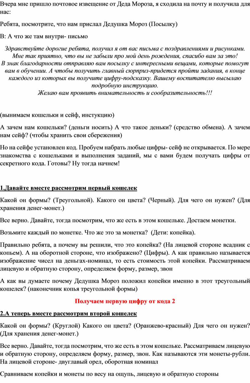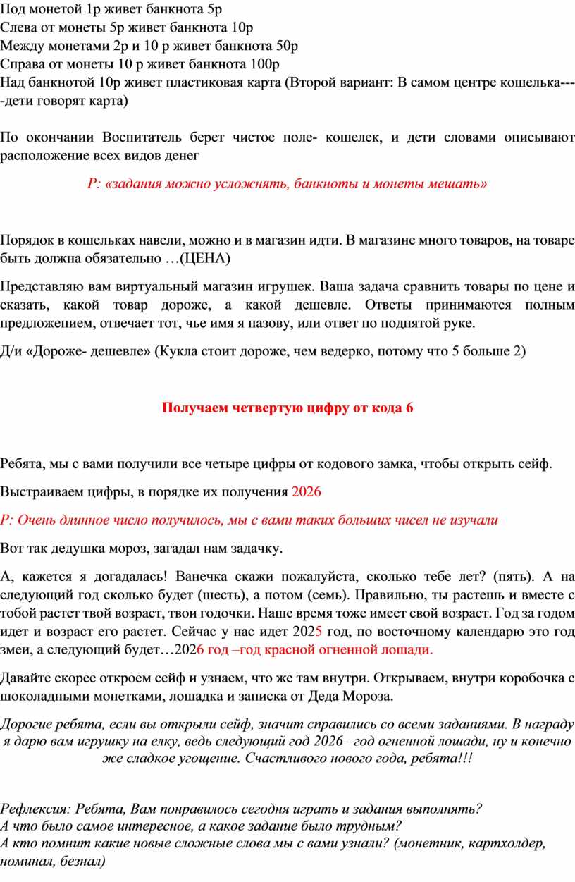 Оборудование и раздаточный материал: посылка; 4 кошелька разной формы (треугольный, круглый, прямоугольный, картхолдер; набор копеек, монет, банкнот, банковская карта; сейф, 2 мольберта; 2 набора 5-ти рублевых монет разной величины; числа-карточки от 1 до 10, карточки рубли 1,2,5 и 10; предметные картинки с изображением копейки и рубля, кошельки-поля и набор денежных средств (на каждого ребёнка); карточки-цифры кода для сейфа 2,0,2,6; набор шоколадных монет, игрушка на елку лошадка, календарь на 2026 год лошади