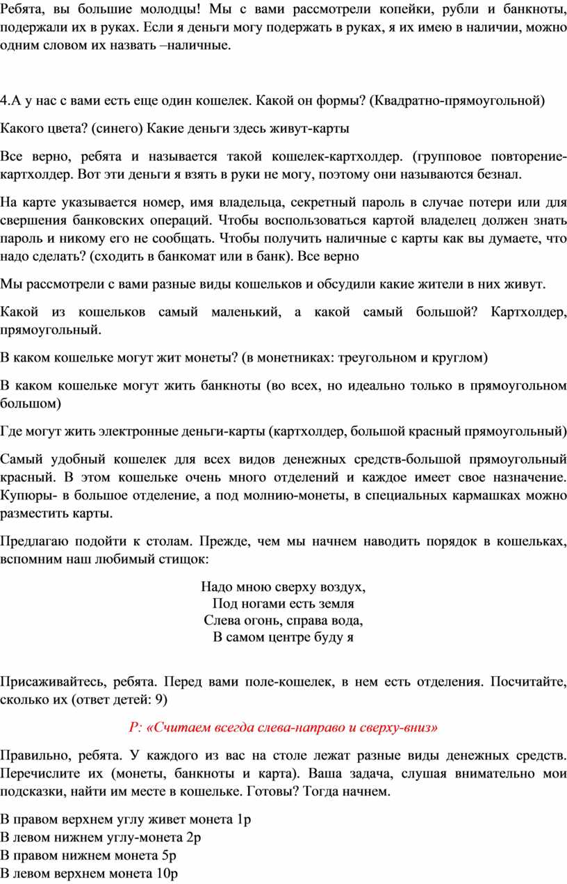 Правильно, ребята. У каждого из вас на столе лежат разные виды денежных средств. Перечислите их (монеты, банкноты и карта). Ваша задача, слушая внимательно мои подсказки, найти им месте в кошельке. Готовы? Тогда начнем.