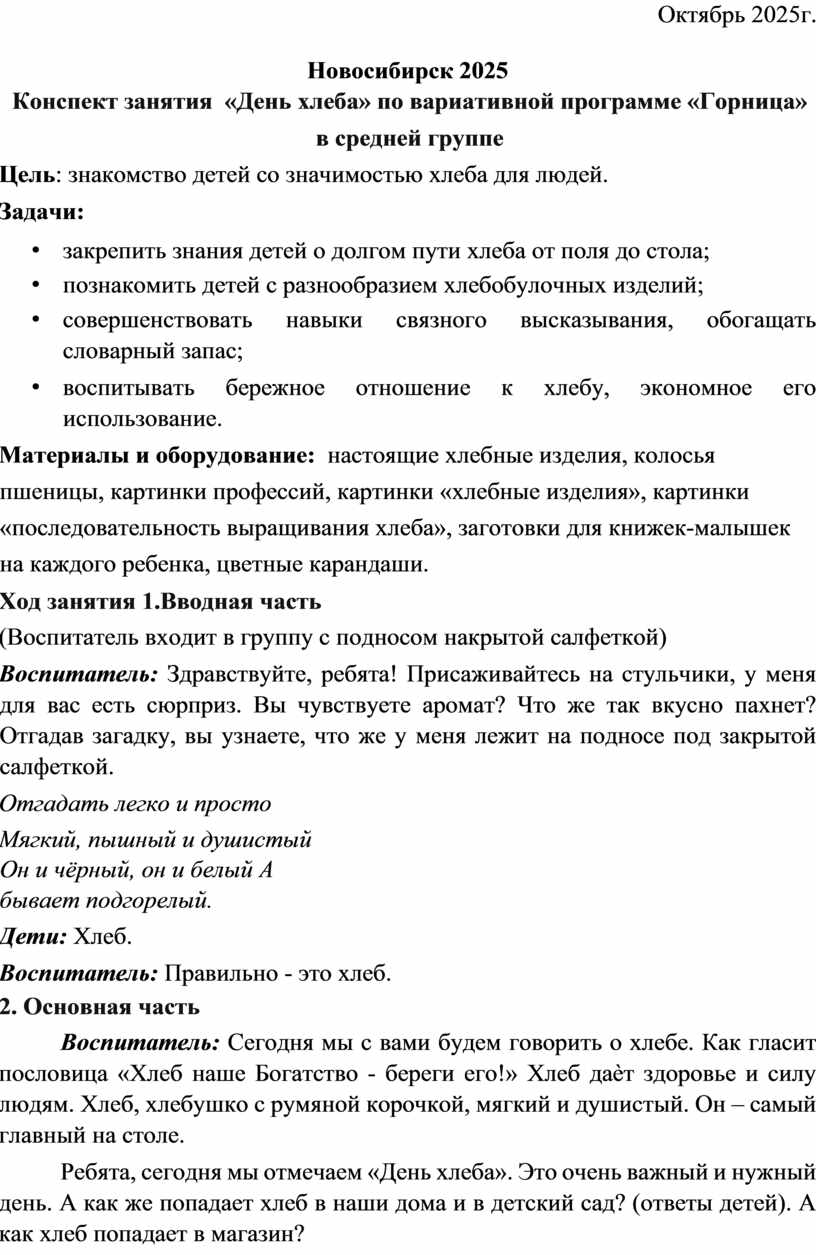 Конспект занятия «День хлеба» по вариативной программе «Горница» в средней группе