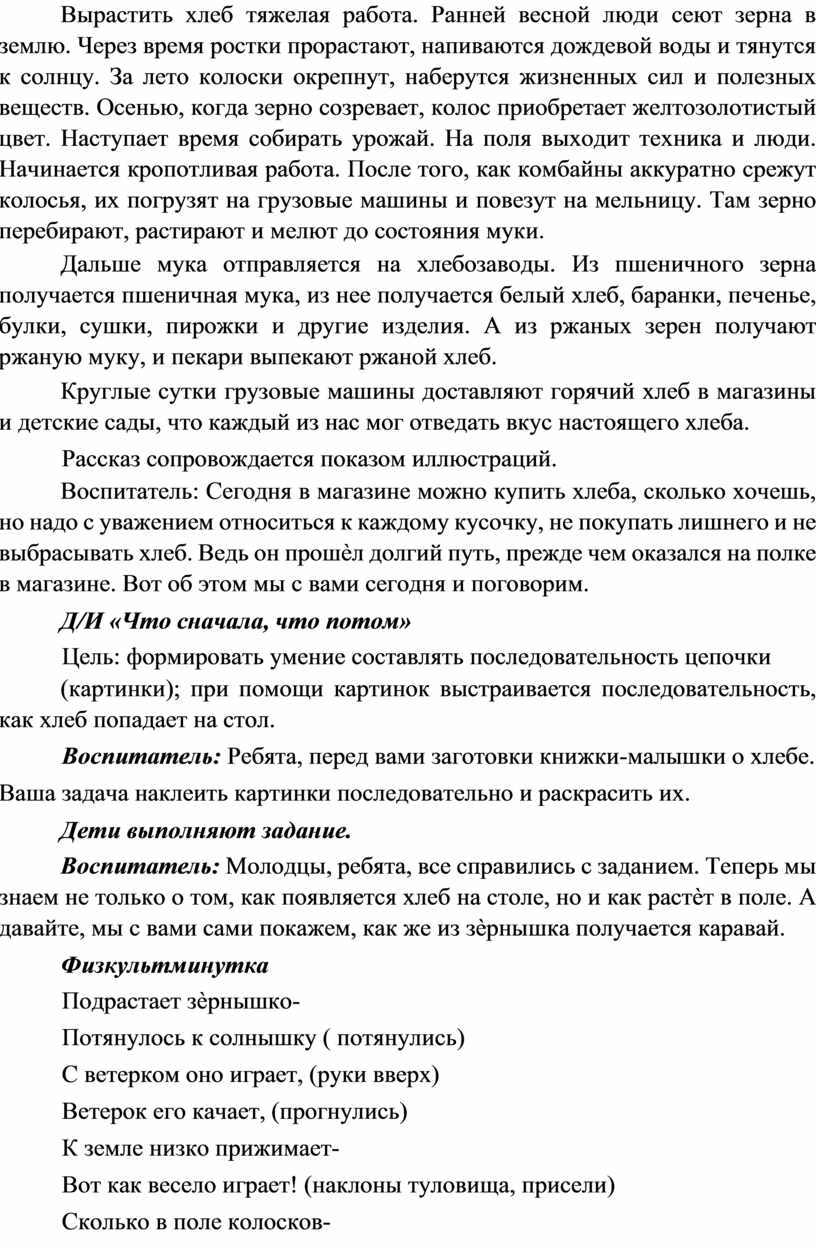 Воспитатель: Сегодня мы с вами будем говорить о хлебе. Как гласит пословица «Хлеб наше Богатство - береги его!» Хлеб даѐт здоровье и силу людям. Хлеб, хлебушко с румяной корочкой, мягкий и душистый. Он – самый главный на столе.