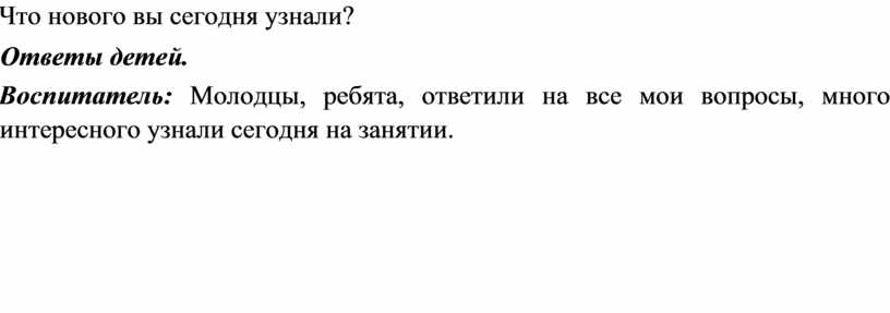 Воспитатель: Молодцы, ребята, ответили на все мои вопросы, много интересного узнали сегодня на занятии.