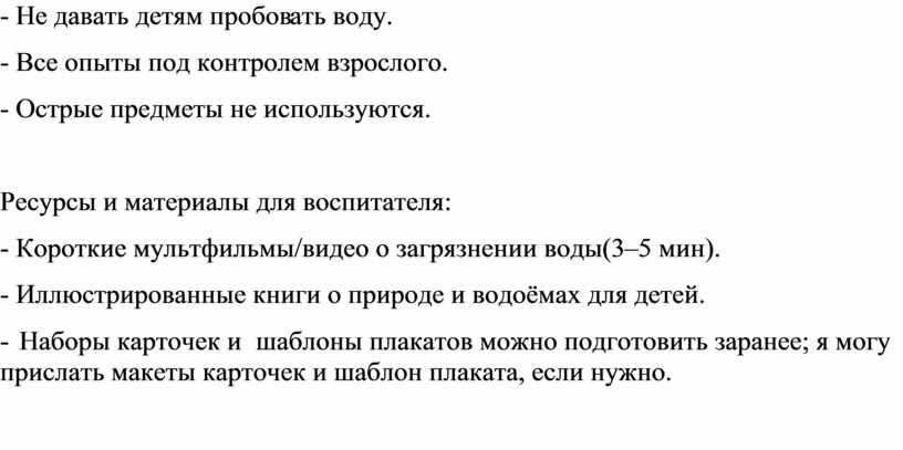 - Меры предосторожности: дети не пробуют воду, все манипуляции — под контролем взрослого.