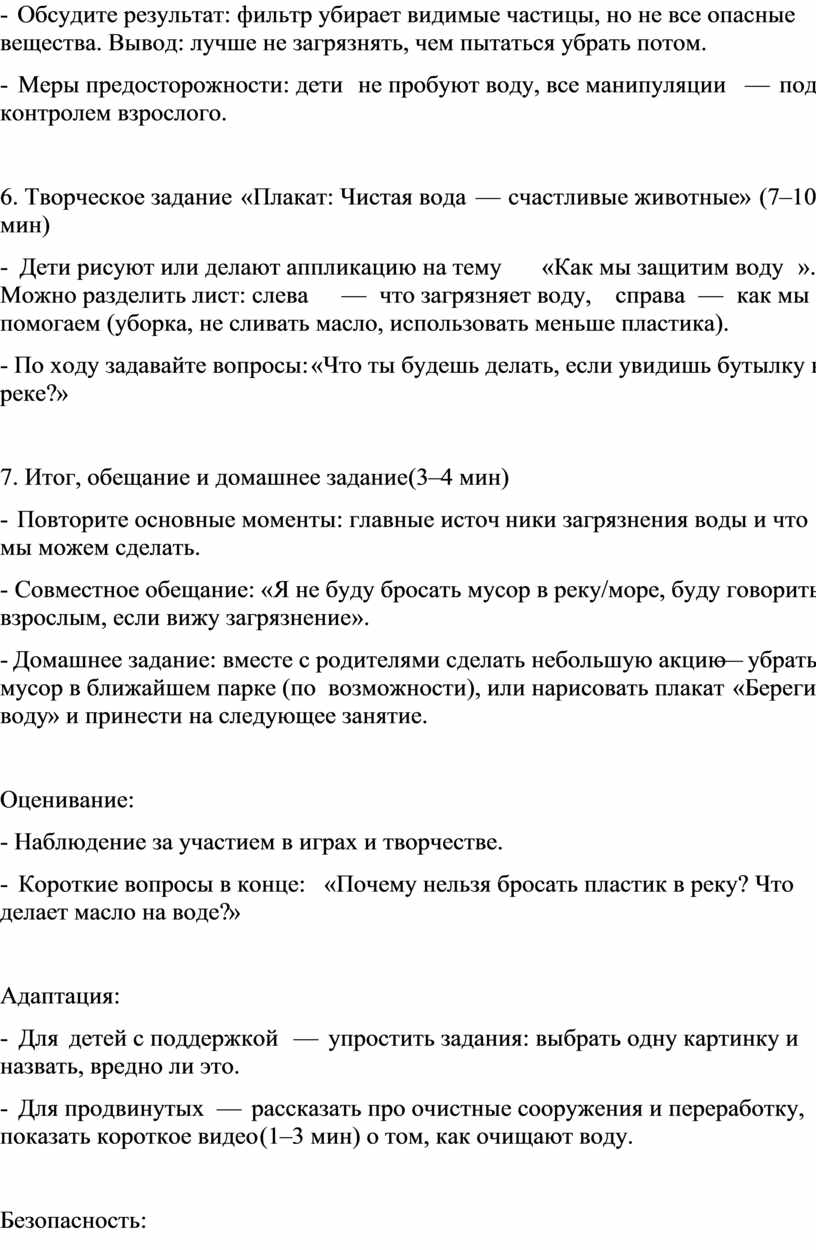 - Домашнее задание: вместе с родителями сделать небольшую акцию — убрать мусор в ближайшем парке (по возможности), или нарисовать плакат «Береги воду» и принести на следующее занятие.