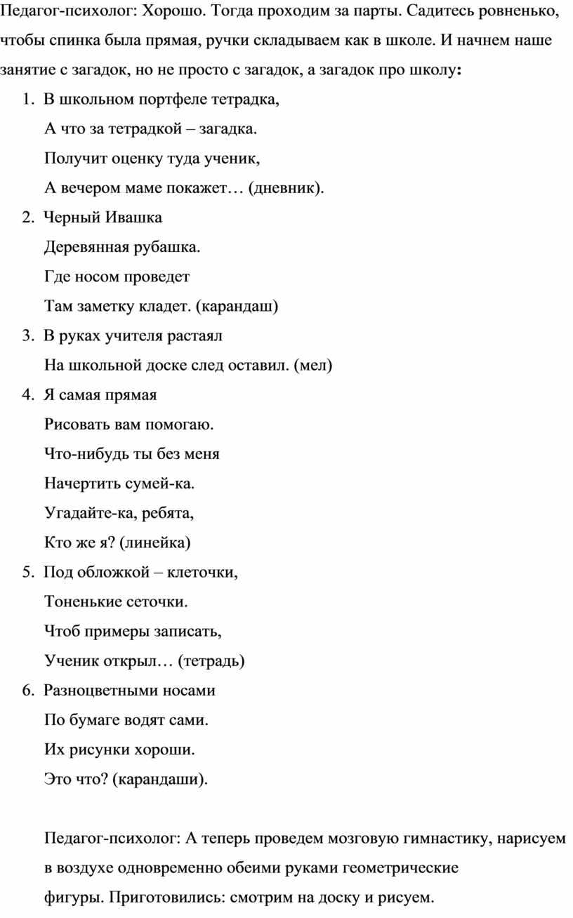 Педагог-психолог: Хорошо. Тогда проходим за парты. Садитесь ровненько, чтобы спинка была прямая, ручки складываем как в школе. И начнем наше занятие с загадок, но не просто с загадок, а загадок про школу: