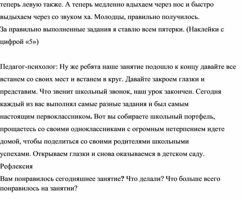 Педагог-психолог: Ну же ребята наше занятие подошло к концу давайте все встанем со своих мест и встанем в круг. Давайте закроем глазки и представим. Что звенит школьный звонок, наш урок закончен. Сегодня каждый из вас выполнял самые разные задания и был самым настоящим первоклассником. Вот вы собираете школьный портфель, прощаетесь со своими одноклассниками с огромным нетерпением идете домой, чтобы поделиться со своими родителями школьными успехами. Открываем глазки и снова оказываемся в детском саду.