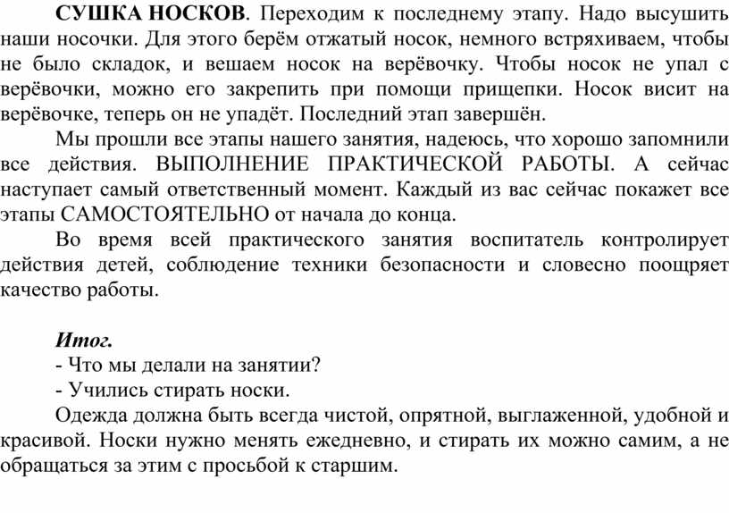 СУШКА НОСКОВ. Переходим к последнему этапу. Надо высушить наши носочки. Для этого берём отжатый носок, немного встряхиваем, чтобы не было складок, и вешаем носок на верёвочку. Чтобы носок не упал с верёвочки, можно его закрепить при помощи прищепки. Носок висит на верёвочке, теперь он не упадёт. Последний этап завершён.