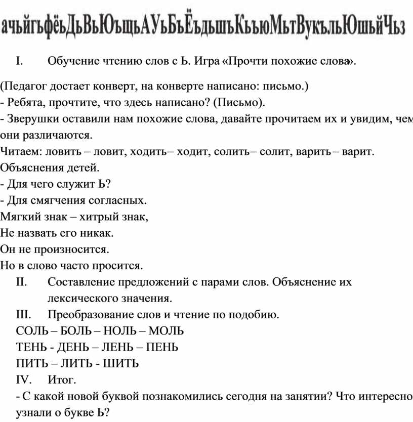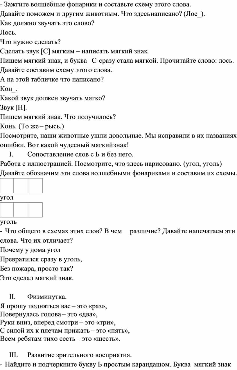 Оборудование: звуковые домики; буква мягкий знак; фонарики красного, синего, зеленого цвета с колокольчиками и без; конверт, на нем написано: «письмо»; игрушки: гусь, лось, конь, рысь; наборное полотно с буквами; карточки со словами: гус_, лос_, кон_, рыс_, ловить – ловит, ходить – ходит, солить – солит, варить – варит; простой карандаш.