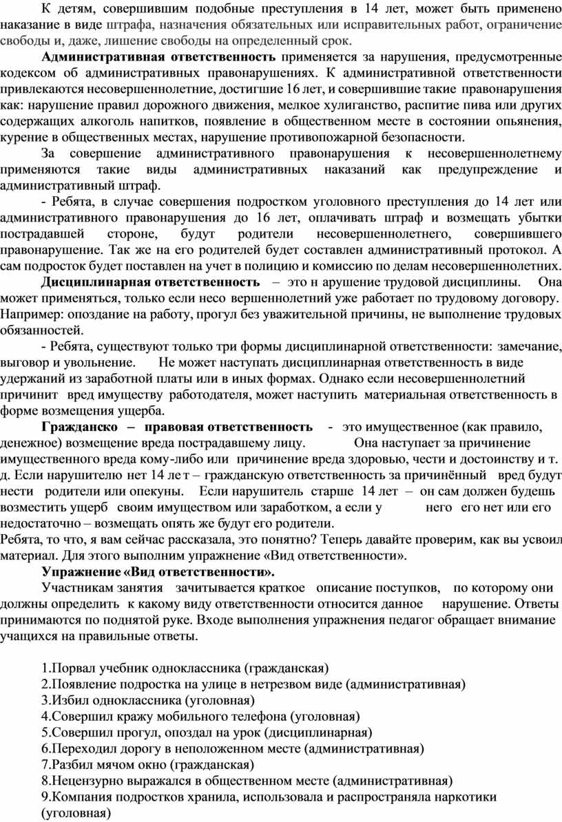 - познакомить несовершеннолетних с понятиями «административная», «уголовная», «дисциплинарная» и «гражданская ответственность», разъяснить их особенности;