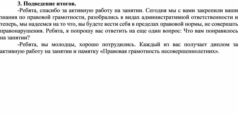 -Ребята, спасибо за активную работу на занятии. Сегодня мы с вами закрепили ваши знания по правовой грамотности, разобрались в видах административной ответственности и теперь, мы надеемся на то что, вы будете вести себя в пределах правовой нормы, не совершать правонарушения. Ребята, я попрошу вас ответить на еще один вопрос: Что вам понравилось на занятии?