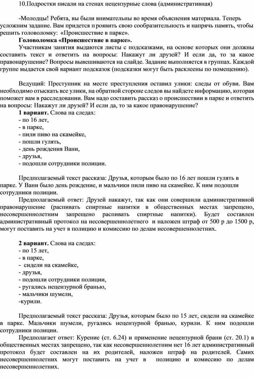 Ведущий: Преступник на месте преступления оставил улики: следы от обуви. Вам необходимо отыскать все улики, на обратной стороне следов вы найдете информацию, которая поможет вам в расследовании. Вам надо составить рассказ о происшествии в парке и ответить на вопросы: Накажут ли друзей? И если да, то за какое правонарушение?