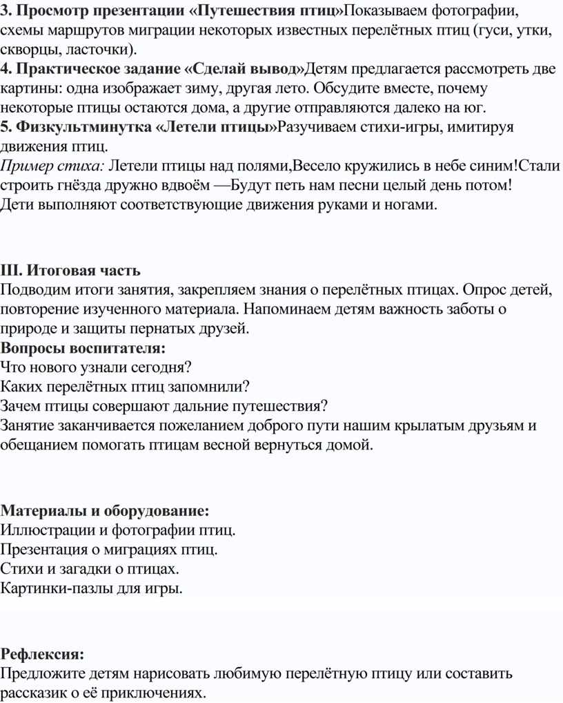 Подводим итоги занятия, закрепляем знания о перелётных птицах. Опрос детей, повторение изученного материала. Напоминаем детям важность заботы о природе и защиты пернатых друзей.