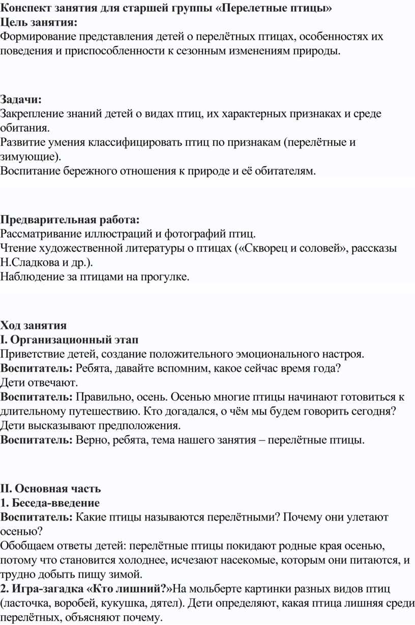Конспект занятия для старшей группы «Перелетные птицы»