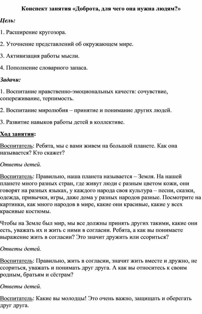 Конспект занятия «Доброта, для чего она нужна людям?»