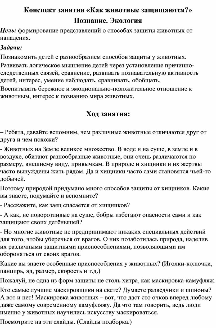 1. Познакомить детей с разнообразием способов защиты у животных.
