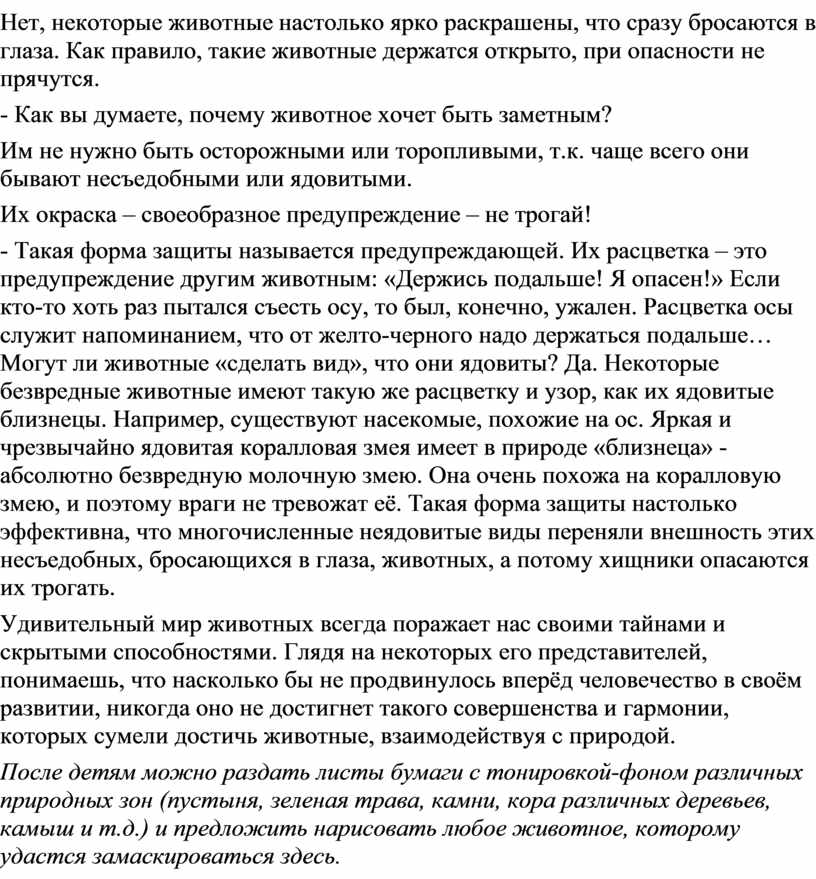 После детям можно раздать листы бумаги с тонировкой-фоном различных природных зон (пустыня, зеленая трава, камни, кора различных деревьев, камыш и т.д.) и предложить нарисовать любое животное, которому удастся замаскироваться здесь.