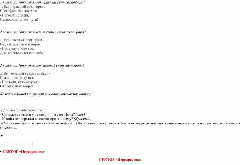 Дополнительные вопросы: - Сколько сигналов у пешеходного светофора? (Два.) - Какой свет верхний на светофоре и почему? (Красный.) -Почему придуман желтый свет светофора? (Так как транспортные средства не могут мгновенно остановиться и им нужно время для изменения скорости).