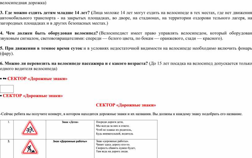 СЕКТОР «ВЕЛОСИПЕД» Следующая станция «Велосипед». Велосипед – наш большой друг, который как и мы с нетерпением ждет весны и каникул. Многие из наших ребят хорошо умеют ездить на велосипеде. Но знают ли они правила дорожного движения для велосипедистов? 1. С какого возраста можно управлять велосипедом при движении по дорогам? ((Правила езды на велосипеде для детей позволяют ездить по дорогам детям старше 14 лет). 2. В каком случае можно управлять велосипедом при движении по дорогам? (Если имеется велосипедная дорожка) 3. Где можно ездить детям младше 14 лет? (Лица моложе 14 лет могут ездить на велосипеде в тех местах, где нет движения автомобильного транспорта - на закрытых площадках, во дворе, на стадионах, на территории оздорови тельного лагеря, на загородных площадках и в других безопасных местах.) 4. Чем должен быть оборудован велосипед? (Велосипедист имеет право управлять велосипедом, который оборудован звуковым сигналом, световозвращателями: спереди — белого цвета, по бокам — оранжевого, сзади — красного). 5. При движении в темное время суток и в условиях недостаточной видимости на велосипеде необходимо включить фонарь (фару). 6. Можно ли перевозить на велосипеде пассажира и с какого возраста? (До 15 лет посадка на велосипед допускается только одного водителя велосипеда)