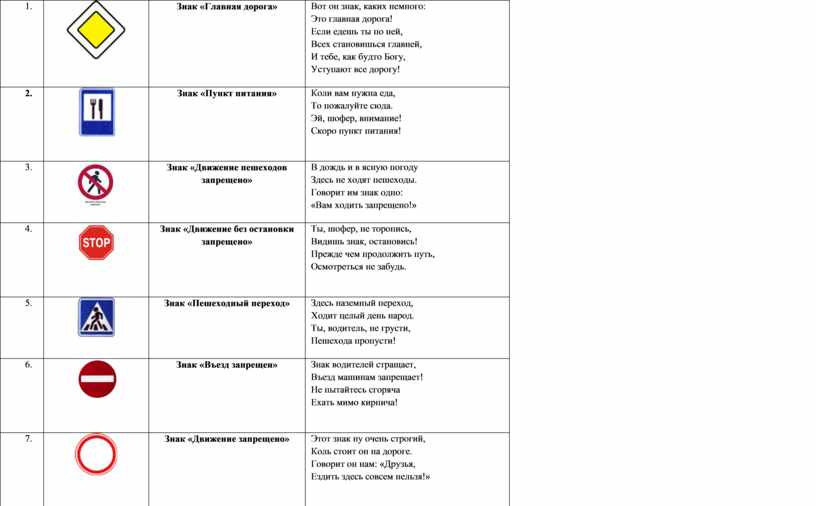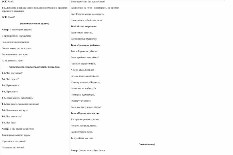 Всем-всем-всем без исключенья! Если встану на пути – ни проехать, ни пройти! Брат Кирпич, скажи на милость, Что вдвоем с тобой – мы сила! Знак «Въезд запрещен». Если только захотим, Всё движенье прекратим! Знак «Дорожные работы». Знак «Дорожные работы» Всем прибавит вам заботы! Главным сделайте меня, А не то средь бела дня Встану я на главной трассе И скажу машина: «Здрасьте! Не хотите ли в объезд?» Перекрою всем проезд, Обеспечу суматоху. Всем вам сразу станет плохо! Знак «Прочие опасности». Я в пути встречаюсь редко, Но зато, поверьте, метко. Если встретите меня, То пугайтесь как огня! (знаки спорят) Автор. Спорят меж собою Знаки. Как бы не дошло до драки! И вот в этот сложный час Вдруг до них донесся глас. (появляется перекрёсток) Перекрёсток. Вы совсем с ума сошли?! Вы куда с меня ушли? Знак «Главная дорога». Это кто? Перекрёсток. Ваш Перекрёсток! Ваш отец почти что крёстный! Спину мне натёрли шины: В пять рядов стоят машины! Ругань, суматоха, гам! Как не стыдно, Знаки, вам?! Знак «Главная дорога». Тороплюсь, лечу, бегу! Всем машинам помогу – К цели все сейчас поедем. До свидания, соседи! Знак «Пешеходный переход» (Знаку «Осторожно: дети!») Думаю, пора назад! Поспешим скорее, брат! Ждут нас слава и почёт, Ведь укажем переход. Знаки «Въезд запрещён» и «Движение запрещено». На дороге неполадки! Там без нас совсем не сладко! И движенью не во вред, Если кое-где запрет! Встанем мы на старом месте, Нам и там довольно чести! Знаки «Дорожные работы» Поспешим и мы скорее! А не то гляди Не заметит кто траншею Или яму впереди! Автор. Знаки стали по местам, Стих немедля шум и гам, зашуршали скоро шины, Покатилися машины, И наладилось движенье В тот же миг без напряженья. (вперед выходят четыре участника) 1-й. Мы вам сказку рассказали. В ней особой нет морали… 2-й. Ведь любой субъект движенья Вызывает уваженье. 3-й. Не считай, что ты всех круче, ПДД учи получше! 4-й. И шофёр и пешеход Движутся лишь в свой черёд. 5-й. Коль друг с другом все согласны. ВСЕ. То дороги безопасны!