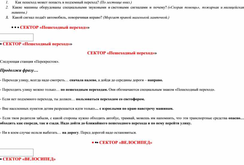 СЕКТОР «Пешеходный переход»» Следующая станция «Перекресток». Продолжи фразу… - Переходя улицу, всегда надо смотреть… сначала налево, а дойдя до середины дороги – направо. - Переходить улицу можно только… по пешеходным переходам. Они обозначаются специальным знаком «Пешеходный переход». - Если нет подземного перехода, ты должен… пользоваться переходом со светофором. - Вне населенных пунктов детям разрешается идти только… с взрослыми по краю навстречу машинам. - Если твои родители забыли, с какой стороны нужно обходить автобус, трамвай, можешь им напомнить, что эти транспортные средства опасно… обходить как спереди, так и сзади. Надо дойти до ближайшего пешеходного перехода и по нему перейти улицу. - Ни в коем случае нельзя выбегать… на дорогу. Перед дорогой надо остановиться.