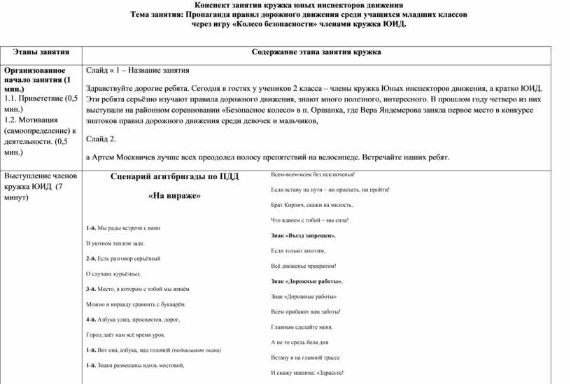 Конспект занятия кружка юных инспекторов движения